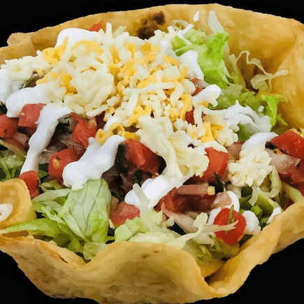 Served on a crispy flour taco shell topped with beans, meat, lettuce, tomato, sour cream & cheddar cheese